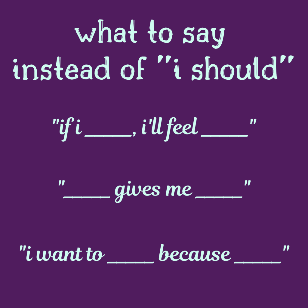 When we say “should,” we’re using shame and guilt to motivate ourselves, which rarely works at effecting change. With a simple rephrase, we can discover our genuine feelings, and usually find a lot more motivation to do things differently.